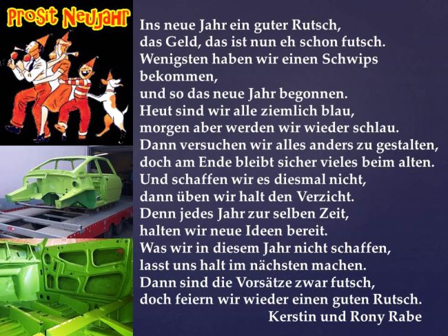 Prosit Neujahr – rufen wir nun aus !   Das neue Jahr bringt Glück und ins Haus!   Alles Gute,